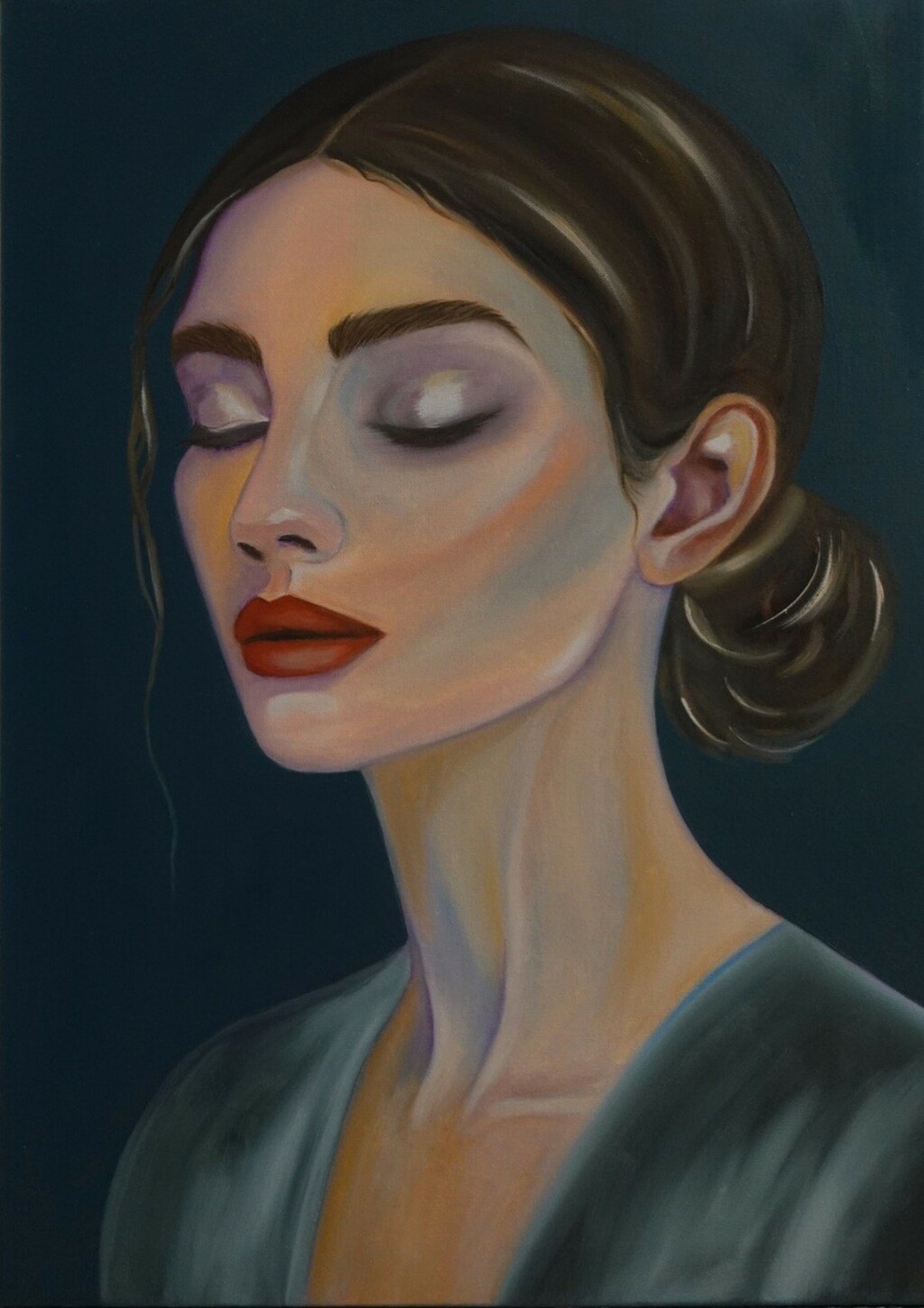 The contours are firm, yet not rigid. There is suppleness in the line of the neck, a fluidity in the tied-back hair, a delicacy in the curve of the lips — all shaping an essentialized femininity, not seductive but introspective, restrained, almost sacred. The closed eyelids become in themselves pictorial surfaces speaking of renunciation, of trust in the inner world.